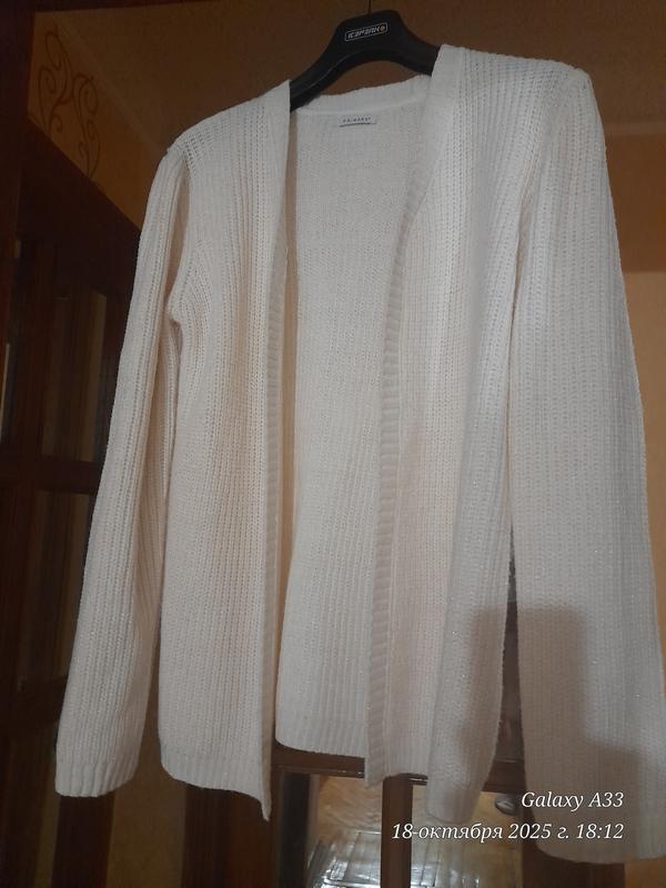 Кардиган, цвет молоко с добавлением тонкой нити люрекса ,без застежки. Размер изделия пог53,длинна 70,рукав 64.