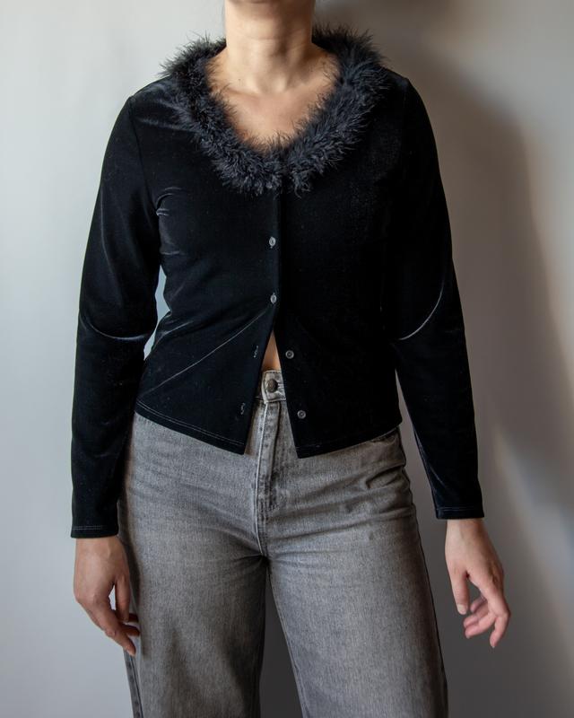 Винтажная бархатная кофта с воротником 🐈⬛ Эффектная черная кофта из мягкого бархата, украшена роскошным воротником из натурального перьев. Имеет застежку на пуговицы и слегка приталенный силуэт - идеальна для создания настроения начала 2000-х. Выглядит эффектно как в вечерних луках, так и в сочетании с джинсами для более расслабленного стиля. Размер М Замеры: плечи 40, пог 47, рукав 60, длина 54 В идеальном состоянии