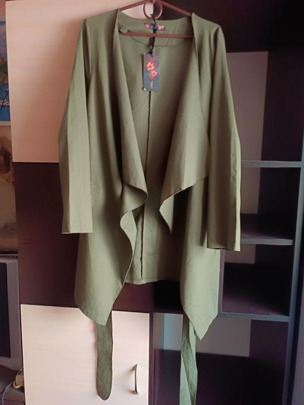 очень красивый кардиган лен, цвет хаки, длина 77 сзади, по переду чуть больше, плечи 39, рукав 60, п/ г 55++