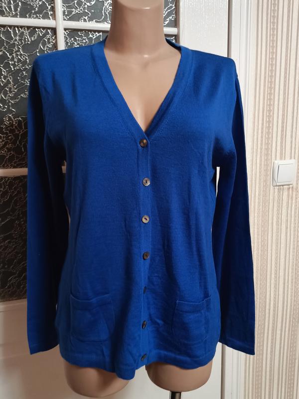 Кардиган в новом состоянии. Бумажная бирка отсутствует. Ткань 100%шерсть мериноса, не колется, качество отличное. Цвет цветов василька, электрик. Размер L. ПОГ 50см Длина 64см Длина рукава от горловины 71см.