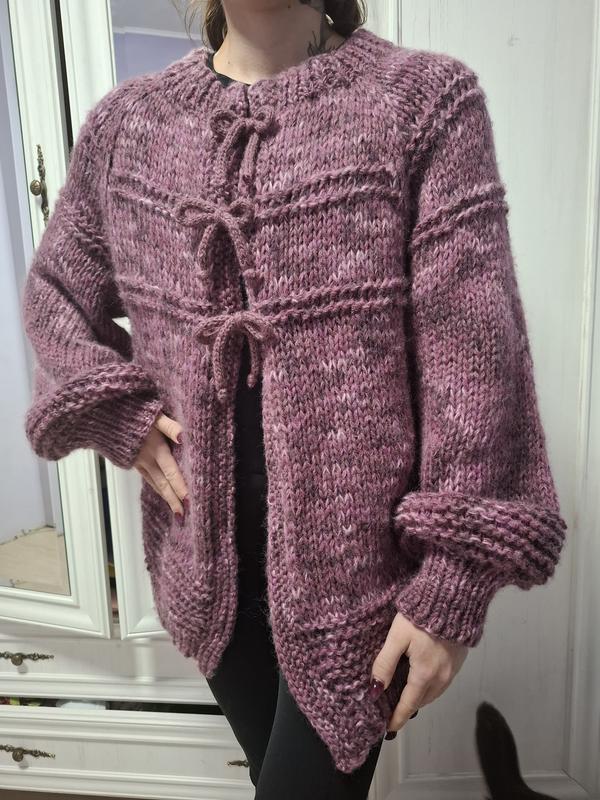 Объемный теплый кардиган из меланжевой пряжи в 3 ните Creafil villa , склад: 5 %вовна, 5% альпака, 90 % акрил, Lady Yarn Angora Love- 20% вовна, 80% акрил Кардиган oversize - с ним вы создадите уютный и романтичный образ, при этом это незаменимая и удобная вещь в гардеробе. Очень мягкий и не колется, поддерживает температуру тела Удобная и свободная посадка, не сковывает движений, идеально дополнит Ваш образ. Размер оверсайз, тянется. подойдет на любой размер, от 40 до 52 Замеры в свободном порядке: ширина ÷56см длина 66см рукав от проймы 45см, от шеи 70см Хорошо тянется Цвет венный, очень красивый. приятный, плавный переход от светлого розового к бордовому. Фото так не передает, наживее, бедней насыщенный цвет, чудес.Осенняя фото Ниточка мягкая, хорошо тянется. красиво садится по фигуре, не утяжелен. вам будет в этом кардиганчике тепло, уютно, приятно. Застежка завязочки.