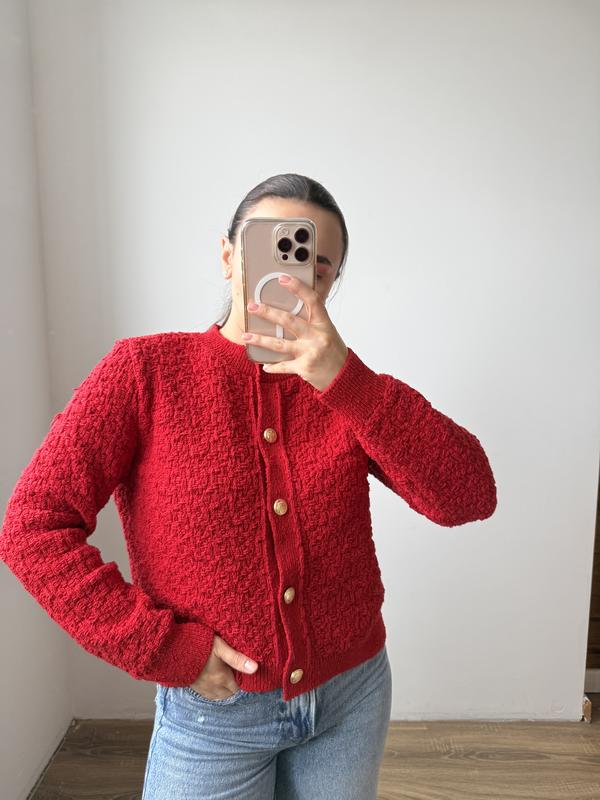 дуже красивий кардиган має насичений червоний колір та золоті акцентні ґудзики