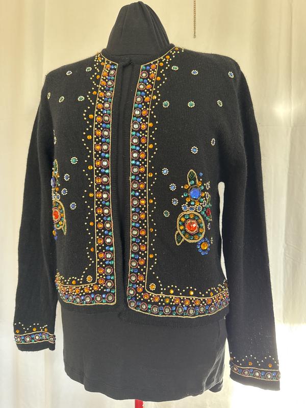 Неймовірно ошатний кашеміровий вишитий кардиган Бренд Giorgio Kauten Склад на фото кашемір ангора Прикрашений бусинами і камінцями. Під чорний тотал блек буде ідеальною прикрасою. Річ яку хочеться роздивлятись. Розмір написано М, але орієнтуйтесь на заміри. Ног 52 Довжина 55 Рукав 66 Зверху один гачок З недоліків відсутній один жовтий камінець збоку знизу (є на фото) інших недоліків немає. Є невеликий торг.