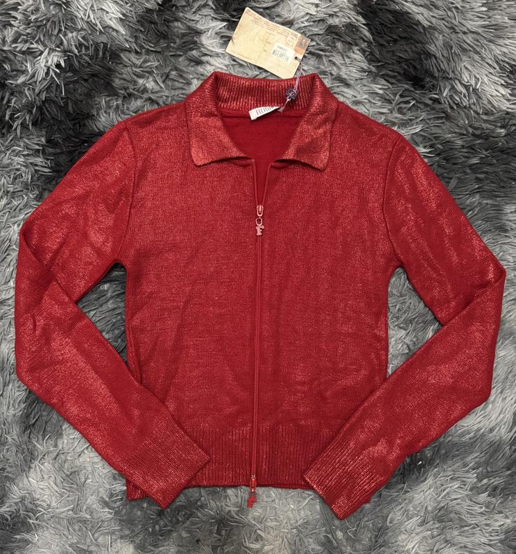 ✨ Стильна блискуча кофточка від Felicita ✨ Колір: насичений червоний з легким металічним відблиском Матеріал: м’яка трикотажна тканина з еластичним ефектом (акрил) Застібка: блискавка спереду Деталі: комір, облягаючий крій, подвійна змійка Стан: нова з біркою ✅ Турція Всі бірки що є на фото Фото на собі не роблю Ідеально підходить для вечірніх виходів, свят чи стильних повсякденних образів 💃 Розмір: (С/М 42/44)