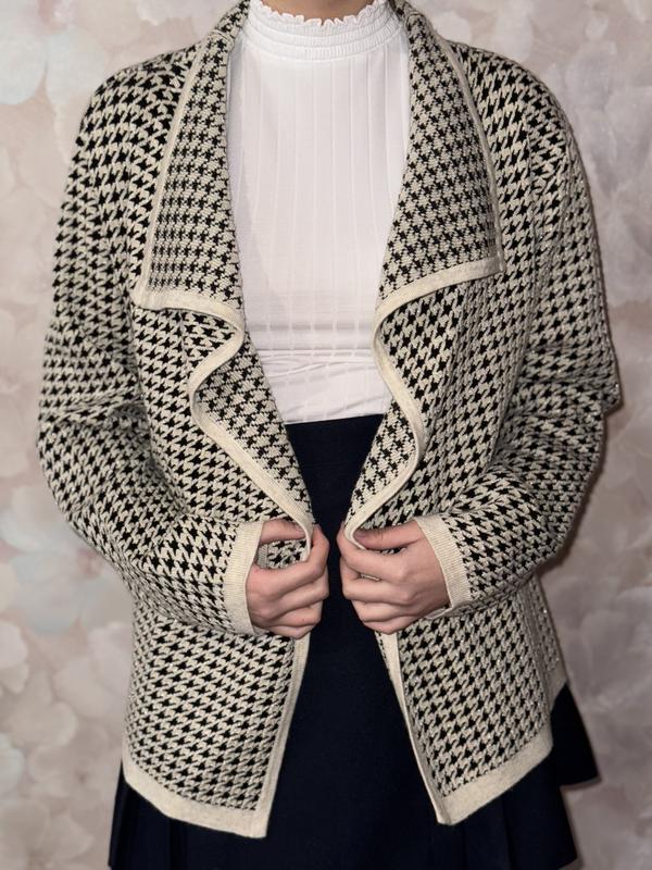 Стан ідеальний, без нарікань Розмір L Тканина доволі щільна, зігрівати буде, тим більше має в складі 5% вовни Має тоненьку люрексову нитку Крій дозволяє «закутатись» в кардиган закріпивши його брошкою.