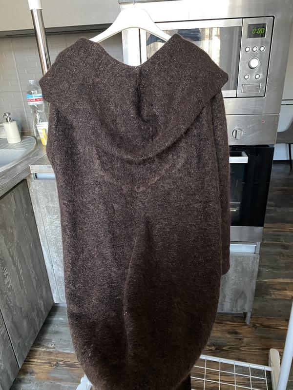Дуже крута річ. Дорогий креативний бренд,ціна сайту близько 500 євро.Обʼємний,теплий,пружний,важкенький . Хороша довжина. Може замінити легке пальто. Без застібок,але чудововиглядає з поясами або брошками-шпильками. Має вкраплення золотої нитки,не дуже помітно,але дуже цікаво підсвічується структура кіідмохеру. Довжина 100 Пог( замір по спинці,спереду ширше) 52 Рукав від шиї 80 Крій прямий. Під капюшоном є проріз для волосся)