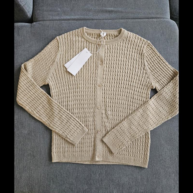 В наличии золотой кардиган Arket в размере s. Будет и на м. ОГ 45-50 см. Рукав 62 см. Длина 56 см. Мягкий и приятный. Имеет золотую нить и за счет этого имеет мерцание. Подойдет как на мир так и на повседневный.