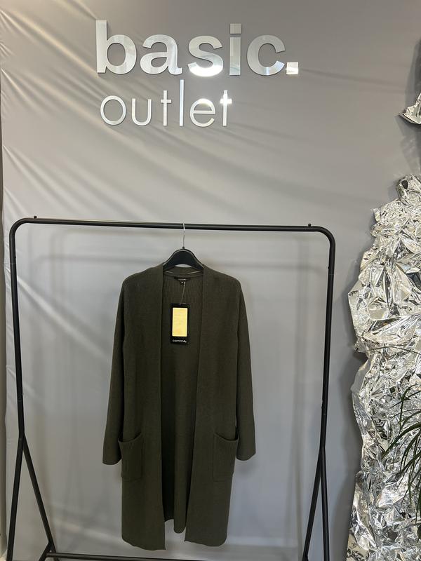 Подовжений жіночий кардиган від бренду comma, кольору хакі з відкритою передньою частиною без застібки. Він має довгі рукави та накладні кишені спереду. Лаконічний і підходить для повсякденного стилю.
