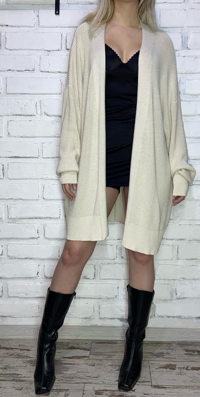 кардиган Zara розмір вказано М, країна виробник Kamboja, 71% віскоза 29% нейлон. стан ідеальний, з недоліка має забруднення на манжеті відіпреться. заміри: довжина 90, пів обхват від підмишки до підмишки 70, довжина рукава, плече приспущене 62( рукава довгі), поб 71