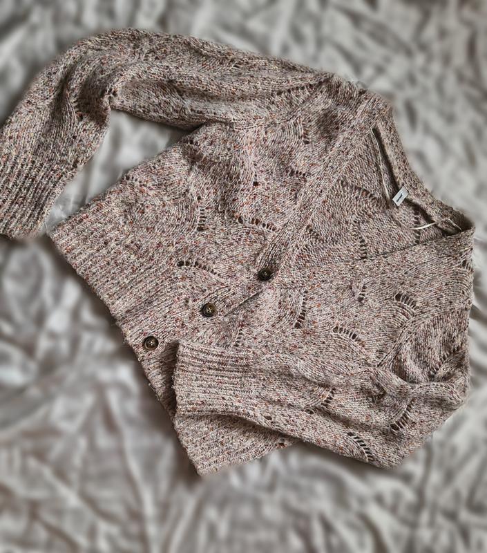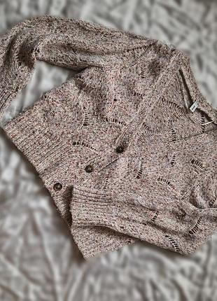Женский кардиган бежевого цвета, с цветными вкраплениями. Благодаря шерсти в составе очень теплый, но совсем не колючий.