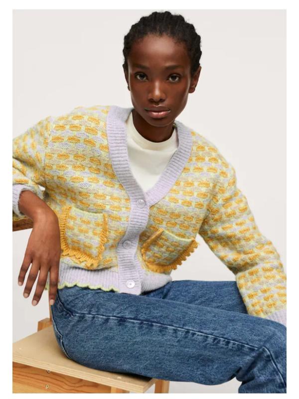 Вязаный кардиган с фиолетовы-желтым узором, с v-образным вырезом, и карманами спереди, раз...