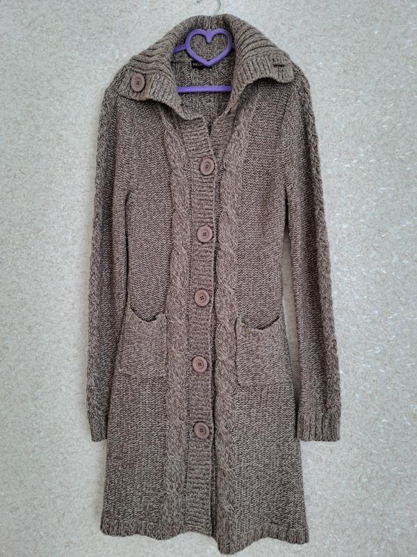 Красивый женский вязаный свитер/кардиган. Имеет два боковых кармана. Украшен массивными пуговицами. Размер L. полуобхват груди - 40 см полуобхват талии - 37 см полуобхват бедер - 42 см длина (по спине) - 96 см длина рукава (от плеча) – 75 см Замеры выполнены в свободном состоянии. Может тянуться до плюс 4-6 см. Состояние очень хорошее.