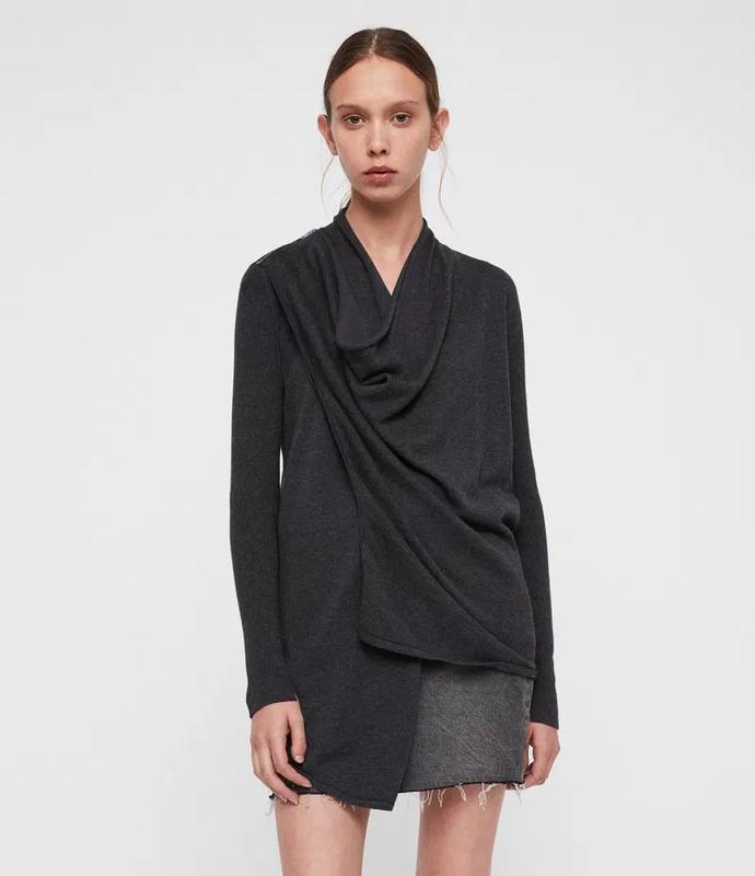 Женский хлопковый кардиган от известного бренда AllSaints. Размер L. Кардиган Drina, незаменимый предмет гардероба круглый год, популярный благодаря своей универсальности. Этот трикотаж можно носить расстегнутым или застегивать молнию на плече, создавая мягкую драпировку. Кардиган имеет воротник-хомут и фирменную асимметричную застежку-молнию. Состояние очень красивое. Замеры: Подмышками 56см Рукав от плеча 67см
