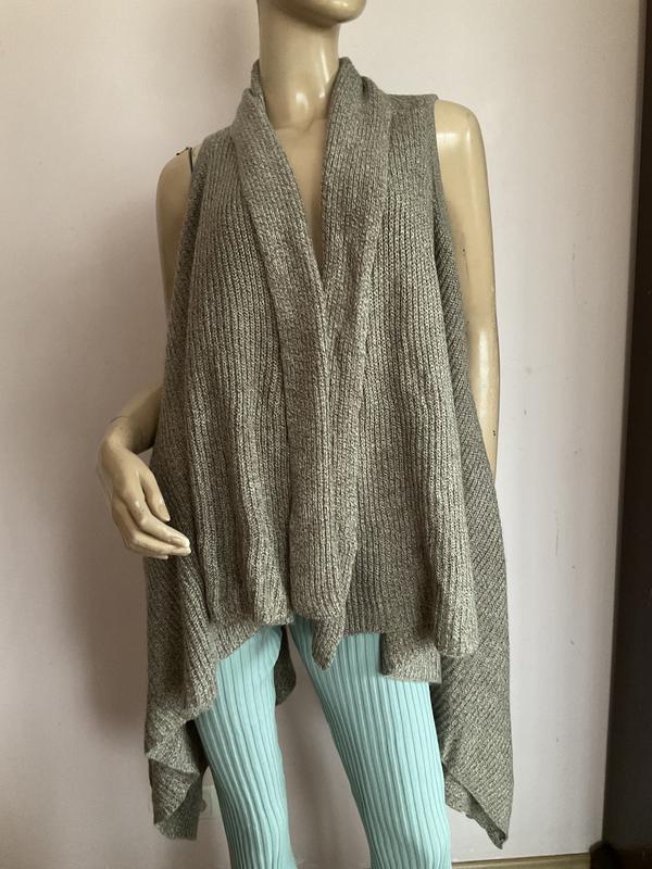 Кардиган жилет свечного фасона, асимметричный. Без застежки. Замеры в груди 53. См в бёдрах 104 см длина 66 см от плеча на зуб 86 см 27:11:25