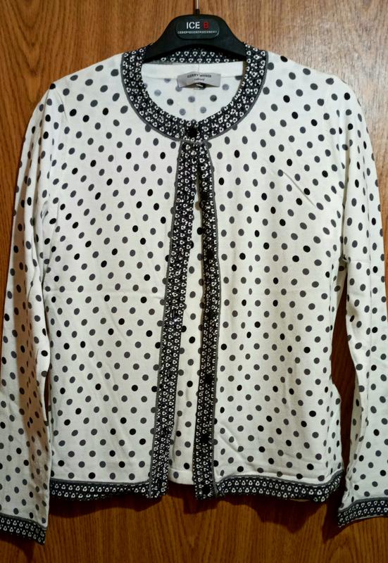 супер классный комплект белого цвета в серый и черный горохджемпер с коротким рукавом и кардиган на пуговичках,хорошо тянется но не теряет форму,размер 36,ориентируйтесь по замерам кардиган ширина плеча 34++ пог 46++ поб 43++ длина рукава 59+ длина 59 джемпер ширина плеча 34++ пог 44++ прб 44++ длина 58 качество супер! смотрится шикарно! ткань очень приятная к телу оплата на карту приват или наложеный платеж по предоплате на доставку