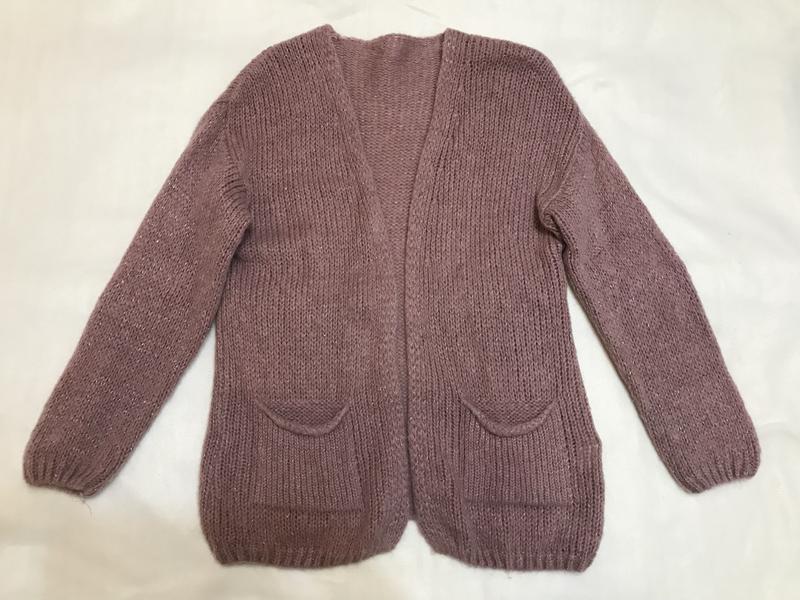 Шикарний жіночий кардиган з вмістом мохеру 30 %.Колір фрезія (пильна троянда ) з люрнксовою ниткою . М’який , не колючий . Ног 50 . Довжина рукава від горловини 75 см . Є кишені . Довжина виробу 65/70 Без застібки