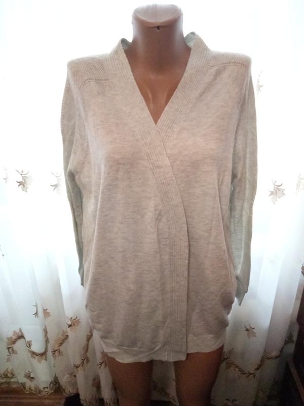 тонкий вязаный кардиган светло-серого цвета, ворот "шалька", длинные с узорной вязкой рукава, по бокам карманчики, не застегивается, подойдет на размер S, M.