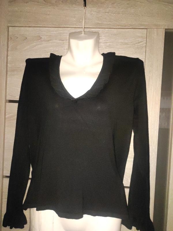 молодежная, красочная☝️укороченная кофта насыщенно- черного цвета состояния идеал к новому☝️AMARANTO, на рукавах и горловине рюши, очень красивая вещь ткань хорошо тянется в составе 82% вискозы, размер указан 18 но смотрите замеры: поп42-52см, рукав от горловины 71-80см пог50-60см п/о по низу48-60см, длина по спинке 57см