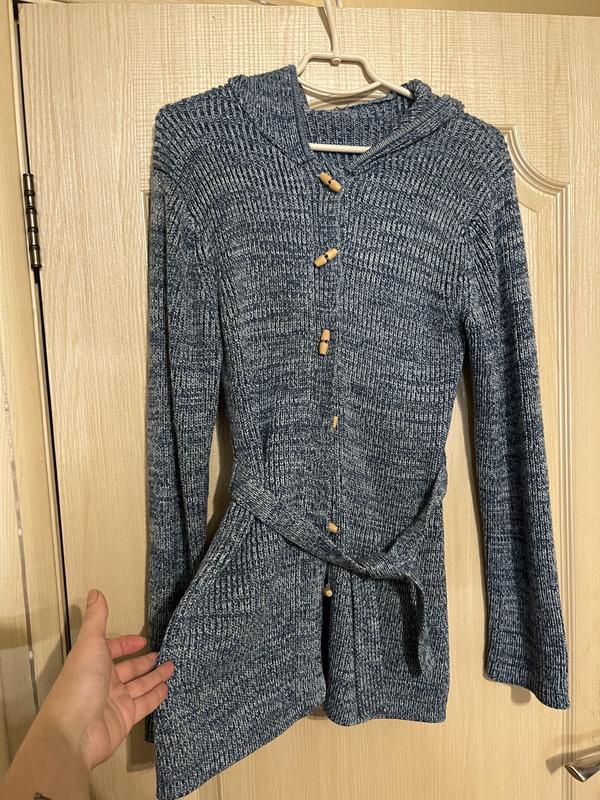 Стильний кардиган, джинсовий меланж, пояс пришитий, оригінальні деревʼяні ґудзики, великий капюшон