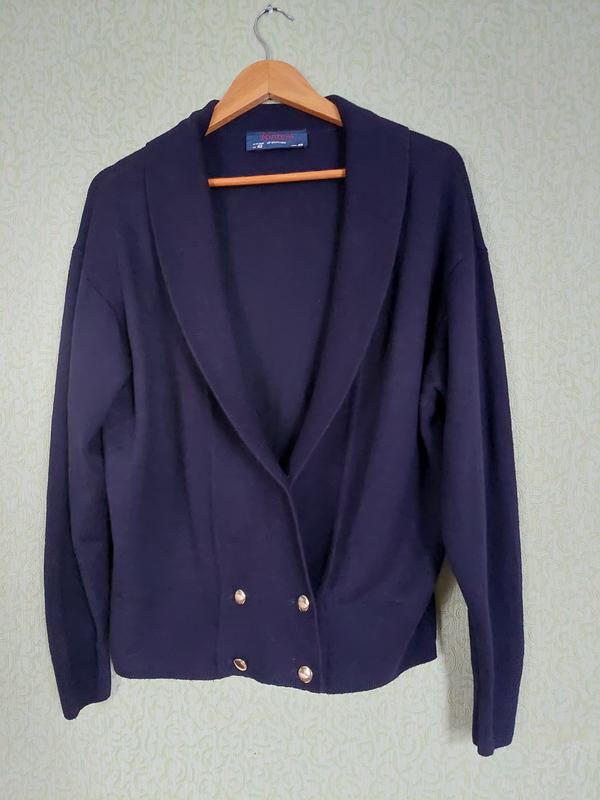 ЗАМІРИ ВНИЗУ темно-синий кардиган ( трикотажный блейзер) с отложным " шаликовым" воротником и золотистыми пуговицами от бренда Kintyre of Scotland, известного производством высококачественного трикотажа из овечьей шерсти и кашемира. Благородного темно синего цвета, изготовленный из 100% высококачественной шерсти, сертифицированной международным знаком Woolmark ( гипоаллергенная, отделка от качания), вязаная простой плотной вязкой, воротник, низ и манжеты ребристая отделка резинкой. Этот фасон является универсальным и подходит как для офисного стиля, так и для создания повседневного элегантного образа, сочетаясь с брюками или юбками. Модель свободного кроя, застегивается на 4 золотистые пуговицы глубокая пройма рукава линия плеч слегка приспущена 56, грудь ПО 63, низ 50 ( макс 63), длина от плеча 63, рукав от горловины вместе с плечом 75 указан размер бренда 42 ( 48 европейский), подойдет на 2ХЛ-3ХЛ, или как оверсайз на ХЛ, ориентироваться по замерам. Без дефектов и следов ношения, а также без бумажных бирок.