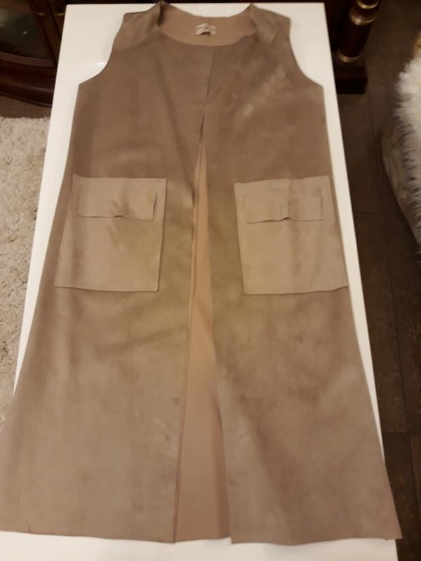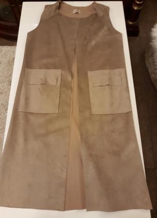Кардиган из эко кожи и замши.Цвет пудра.Длинна 100см.Накладные карманы.