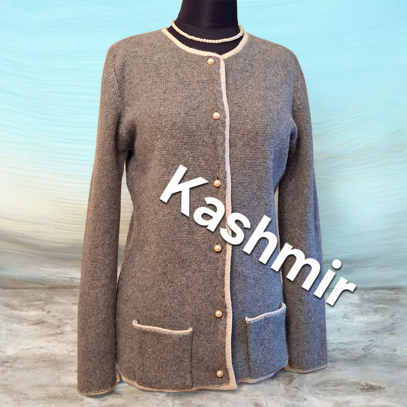 Красивый кашемировый кардиган Peter Hahn приятного серого цвета отделкой из белой нити и жемчужными пуговицами. Отделка белой нитью кашемиром спереди, внизу, на карманах и рукавах. Кардиган настолько нежный и мягкий, что можно одевать на голое тело. Замеры: полуобхват груди-50 см, полуобхват бедер-50 см, ширина по спине-38 см, длина рукава-64 см, длина кардигана по спине-65 см