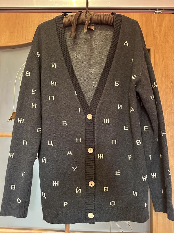 Кардиган українського бренду tm.byme. Колекція присвячена українській мові. Колір сірий, склад бавовна з чимось (відрізала бірку). Розмір М.