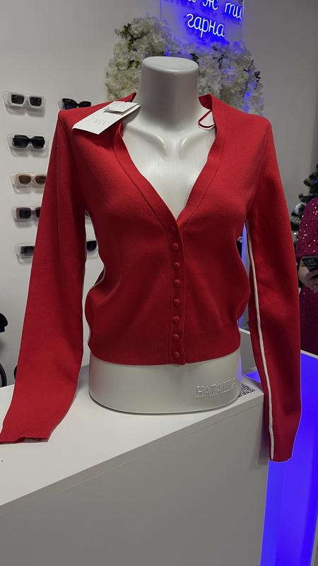 Стильний Кардиган Zara насиченого червоного кольору з контрастними смужками Розміри: S, M