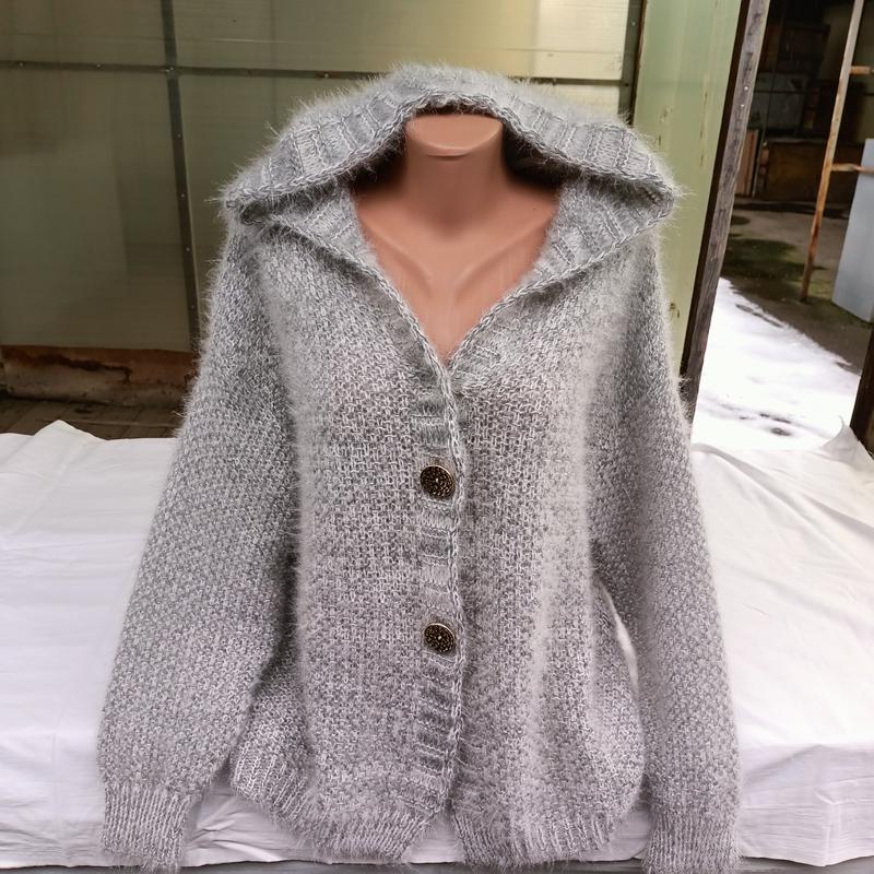 кофточка махеровая на застежке пуговицы, искусственный махер, к телу приятный не кусается, с капюшоном размер 48-50-52 Италия, красиво тянется замеры по изделию: длина 61 см длина рукава от плеча 71 см объем груди 108 см объем бедер 108 см в едином размере овер