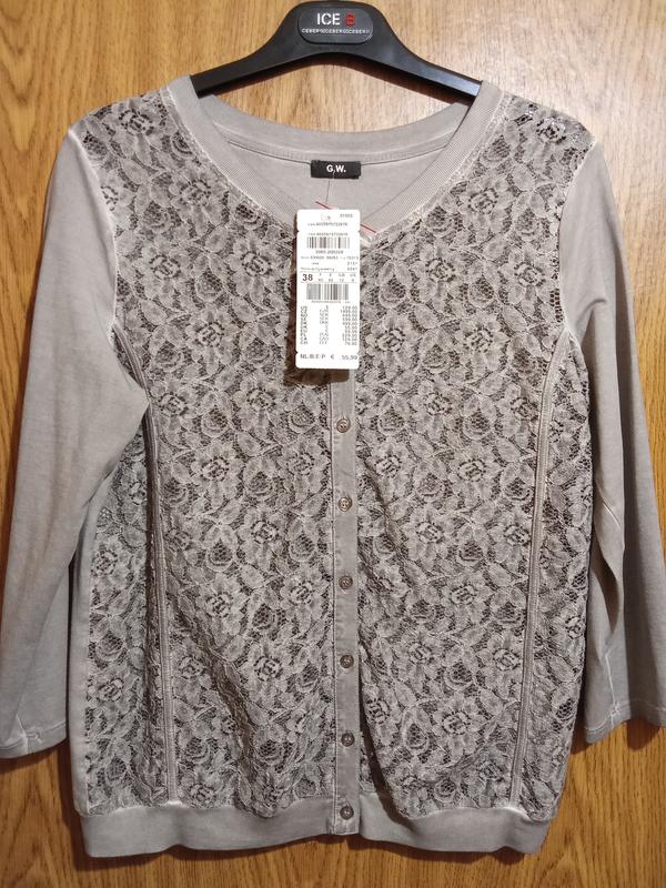 классная кофта кардиган на пуговицах красивого серого цвета с потертостями,впереди гипюр,рукав 3/4, реальная цена 55,99 евро,куплена в бутике в германии,состав хлопок,полиэстер,размер 38 ориентируйтесь по замерам ширина плеча 40 пог 48-49 поб по резинке 44 длина 59 заявленная цена составляет чуть больше половины ее стоимости оплата на карту приват или наложенный платеж по предоплате на доставку