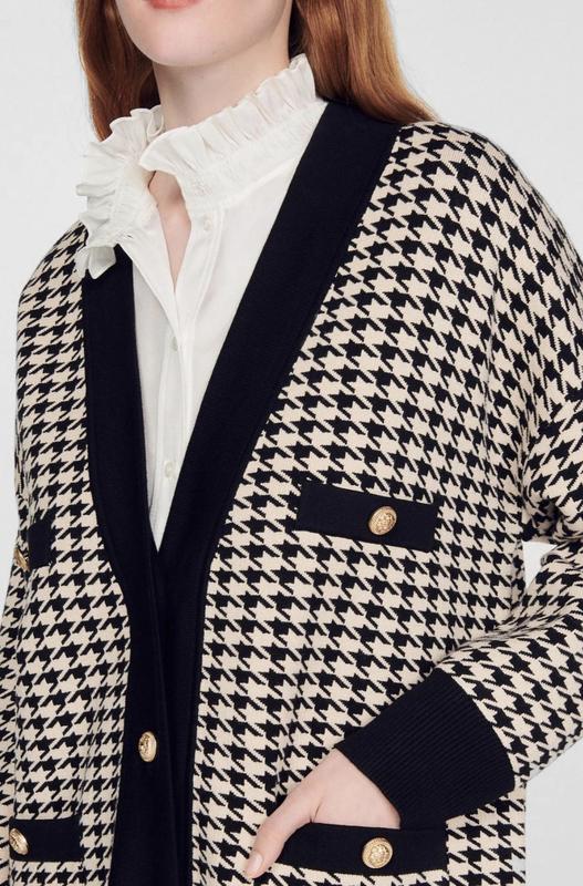 Кардиган Sandro в класичному стилі. Подовжена модель у чорно-білому візерунку "гусяча лапка". Контрастне чорне оздоблення за планкою, манжетами та низом підкреслює силует. М'яка, комфортна тканина добре тримає форму. НОГ — 54 см довжина -71 см