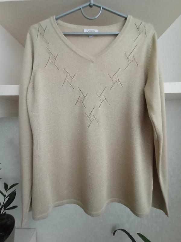 Бежевого цвета с золотистым люрексом. Люрекс не блестящий, нежный. Ткань соткана таким образом, что на изнаношении люрекса нет - мягкая, приятная к телу. Нова. Объем груди 104.