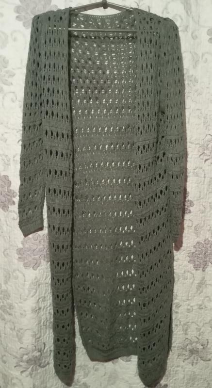 длинный зеленый вязаный (ажурный или крючком) кардиган без застежек. Он имеет открытую переднюю часть, длинные рукава и длину, достигающую ниже колен. Вязкая имеет ажурный узор с заметными отверстиями по всему полотну изделия. Информация о товаре Стиль: Длинный кардиган без пуговиц в повседневном стиле, часто описывается как “duster” или “open-knit”. Цвет: Темно-зеленый, оливковый или хаки. Материал: вероятно, изготовлен из акрила, хлопка или смеси пряжи. Особенности: Ажурная или сетчатая вязка, без карманов, застежек или воротника.