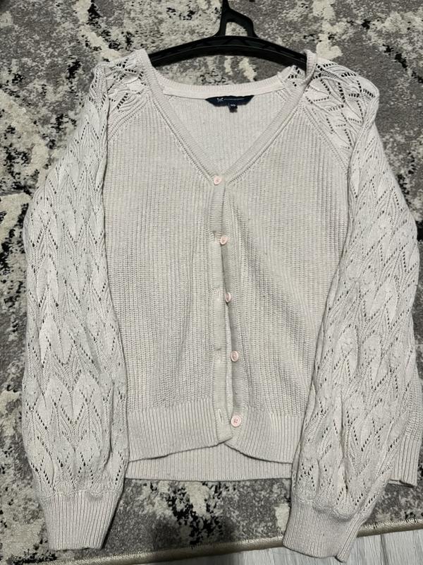 вʼязаний кардеган з рожевими ґудзиками