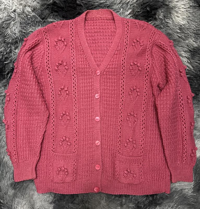 Вінтажний шик: Фактурний кардиган у глибокому ягідному кольорі 🍒 Цей кардиган — справжня знахідка для поціновувачів унікальних речей. Складне плетіння, об'ємні елементи та насичений колір створюють неймовірно затишний образ у стилі «cottagecore». • Особливості в'язки: Декорований об'ємними «шишечками», ажурними доріжками та фактурним візерунком. • Деталі: Має дві функціональні накладні кишеньки спереду. Застібається на ґудзики в тон виробу. • Фасон: Класичний прямий крій з V-подібним вирізом, що пасує до будь-якої фігури. • Колір: Насичений темно-рожевий / марсала (колір стиглої ягоди). Ідеально доповнить вашу улюблену сукню або базові джинси. Тепла та водночас ошатна річ для прохолодних днів. Підійде на розмір М-Л, бірки на ньому відсутні. Стан чудовий, без дефектів. 📩 Для замовлення чекаю на вас у Direct. Фото на собі не роблю.