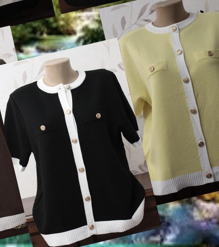 Кофта-Кардиган на ґудзиках Склад 60% віскоза, 10% котон, 30% полієстер Л/ХЛ 50-52 жовта ОГ 110 см Довжина 60 см 👇👇👇 ХЛ/ХХЛ 52-54 білий, чорний ОГ 118 см Довжина 65 см