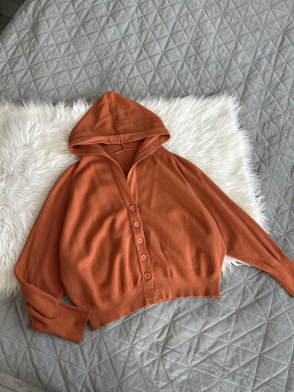 Продам чудовий жіночий кардиган на ґудзиках з капюшоном, вільного крою, розмір С-М, заміряю при потребі! Стан дуже гарний, красивий теракотовий колір! Дивіться інші мої оголошення