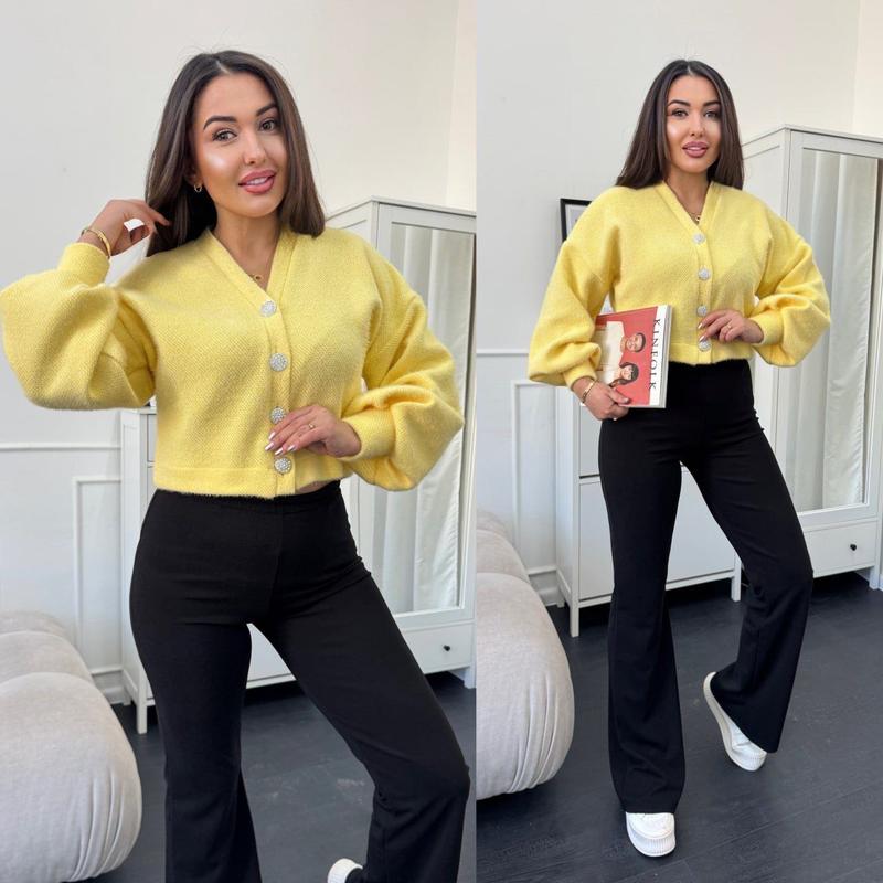 Кардиган арт. pani. 692 Колір: жовтий, рожевий, блакитний Розміри: S, М, L Тканина: трикотаж «альпака» Стильний та нарядний кардиган на ґудзиках зі стразами. Модель укороченого крою з V-подібною горловиною та довгими об’ємними рукавами. Заміри вказані на параметри. Ціна:1000 грн🔥🔥🔥