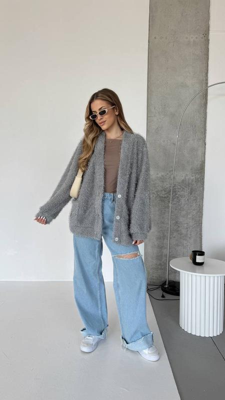 Кардиган в приємному сірому відтінку 🫶 🔝 -якість супер - виглядає ефектно та стильно -має ворсисту текстуру з срібними блискітками ✨ - пухнастий , приємний на дотик . -Застібається на ґудзики , має дві кишені . -універсальний крій . ◽️Мод :227 ◽️розмір: універсал ◽️тканина : неймовірно зносостійка ,, пухнастик ,,( 50%акрил 20% ангора 15% нейлон 15% поліестер ) ✅Заміри по виробу : ОГ 115 ОС 115 ( трішки тягнеться) Довжина по спинці 73 Довжина рукава від горловини 75