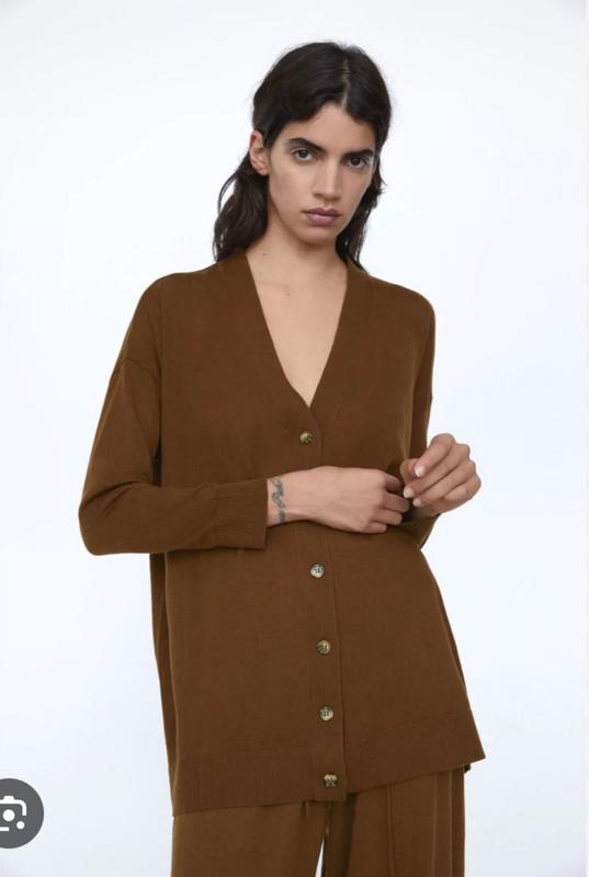Стильный удлиненный кардиган от Zara выполнен в глубоком коричневом цвете и имеет лаконичный V-образный вырез с застежкой на пуговицы. Благодаря мягкому составу изделие приятное на ощупь, красиво держит форму и идеально подходит для создания уютных многослойных образов. Модель имеет свободный крой и изящную вязку в рубчик на манжетах и подоле, что добавляет ей современной элегантности. Замеры: пог- 60 длина- 75 указан размер- S