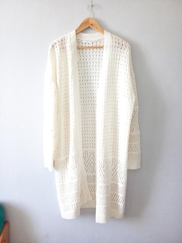 Длинный ажурный кардиган сливочного цвета. Имеет длинный рукав. Без застежек. Стан идеален. Размер по набору XL.