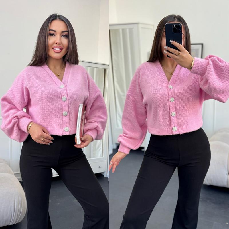 Кардиган Арт. SV 692 Колір: жовтий,рожевий,блакитний рем) Розміри: S, М, L Тканина: трикотаж «альпака» Опис: Стильний та нарядний кардиган на ґудзиках зі стразами. Модель укороченого крою з V-подібною горловиною та довгими об'ємними рукавами. (Заміри вказані на параметри)