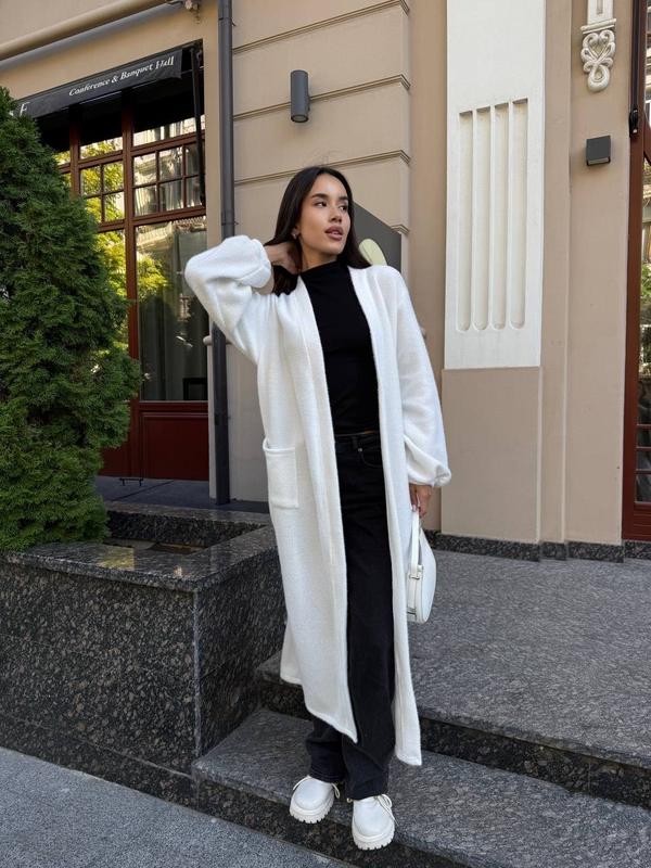Кардиган з альпаки - це любов 🫶 . У такого базового предмету є особливий шарм , з ним можна створювати безліч багатошарових образів А стильний універсальний крій , обʼємні рукава , зручні накладні кишені та трендові відтінки зроблять його фаворитом в вашому гардеробі🫶 ⬜️ Мод 266 ◻️ розмір : універсальний ◻️тканина : альпака . Дуже приємна на дотик ,( достатньо щільна ,не деформується ◻️колір : білий 🤍 ◻️ Заміри по виробу : Кардиган вільного крою . Ідеально сідає від 42 до 50 розміру ПОБ -57 Довжина -130 Довжина рукава від горловини 74
