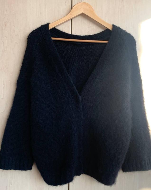 BA&SH двусторонний кардиган альпака/шерсть на кнопках невероятно легкий, мягкий и теплый на сайте похожую модель предлагают носить застежкой назад, но можно и классично надевать размер указан 36й Sка, но пройдет и Mку длина- 66см длина рукава от горловины, так как спущенная линия плеча- 65 см ширина под рукавами- 67