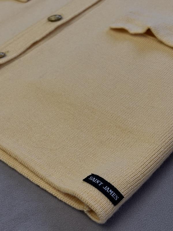 Це жовтий кардиган від французького бренду Saint James. Він виготовлений з вовни та має золотисті ґудзики, V-подібний виріз і накладні кишені. Довжина 77см, плечі 43 см, довжина рукава 59 см, під руками 51 см , низ 50 см