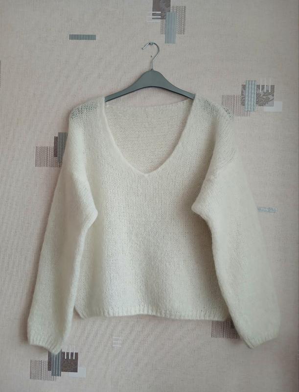 Очень легкий невесомый джемпер белого цвета. Лучше будет, если будет свободным, тогда объемно садится и классно смотрится Бирки со составом нет, но ощущается что пряжа из мохера. Можете заказать безопасную и посмотреть. Длина 56 Полуобхват груди 61 Рукав от горла, потому что линия плеча приспущена- 74 см (считайте что рукав немного короче обычного, потому что ворот V образный и не слишком близко к горлу) Можете не задавать вопросы или в наличии, потому что в наличии и оформлять доставку не попросив