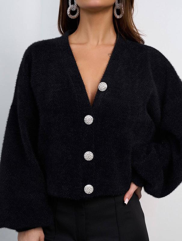 💎💎 Хит продаж 💎💎В НАЯВНОСТІ 💎💎 🌟🌟Кардиган 🌟🌟 Арт. SV 692 Цвет: черный, шоколад Размеры: S, М, L Тканина: трикотаж «альпака» Описание: Стильный и нарядный кардиган на пуговицах со стразами. Модель укороченного кроя с V-образной горловиной и длинными объемными рукавами. (Заміри вказані на параметри)