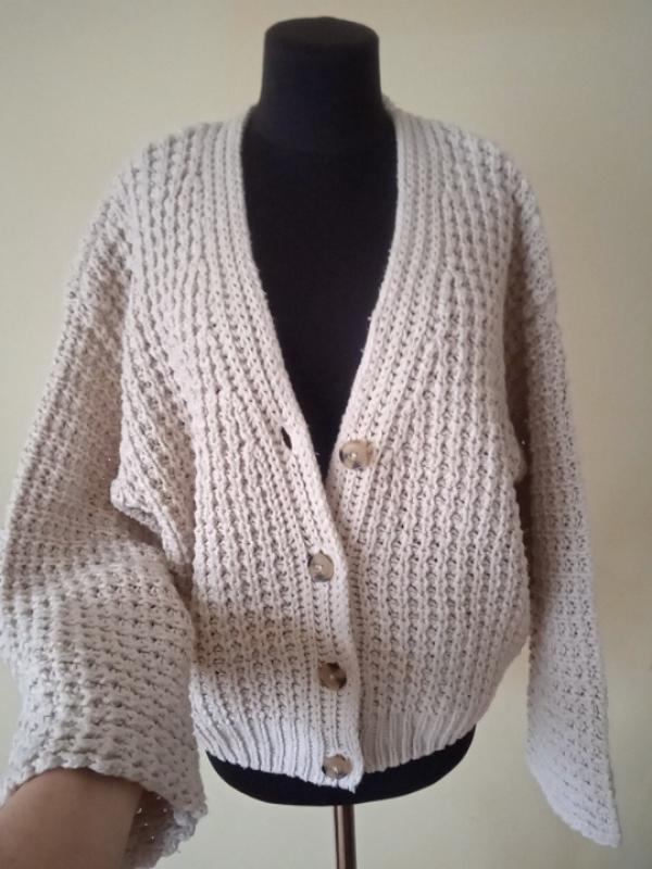 Длина 63 см. Полуобъем груди 56 см. Рукава без манжеты,широкие 52 см. Указан состав 100% акрил но на вид и на ощупь как 100% хлопковая чуть в виде жесткая нить.