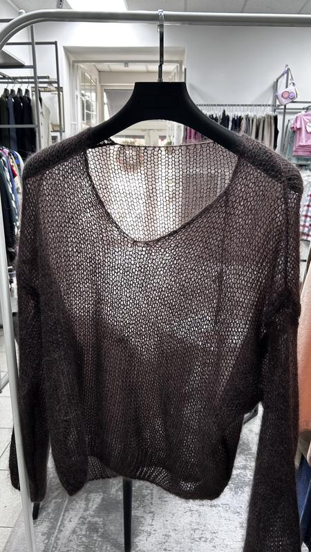 Коричневий светр від Toscana — це вільний в'язаний виріб оверсайз, виготовлений із пухнастої суміші волокон, мохеру. Має легку, напівпрозору сітчасту структуру. Насичений коричневий відтінок, схожий на какао.