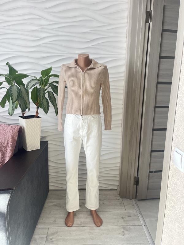 Кофта жіноча бежевого кольору, виконана з м’якого трикотажу в рубчик. Приталений крій, довгі рукави, комірець-поло та застібка на блискавку по всій довжині. Стильна й універсальна — підійде як для повсякденних, так і для більш елегантних образів.Стан нової